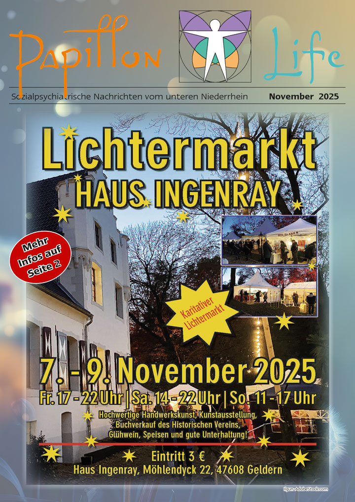 Hier sind die neuesten Ausgaben unserer Zeitung „Papillon Life“ zu finden. Diese wird im Rahmen der tagesstrukturierenden Maßnahmen von unserer Druckerei in Geldern erstellt und erscheint monatlich. Die Zeitung ist nicht nur eine Beschreibung vereinsinterner Entwicklungen und Neuigkeiten, sondern informiert über alle Bereiche der Gemeindepsychiatrie im Kreis Kleve.